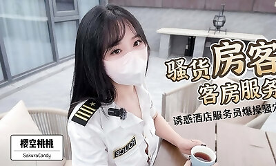 The slut housekeeper in guest room service!seduces the hotel waiter to have her pussy fucked and creampied without a protection!